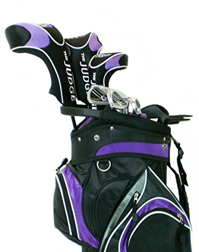 Founders Club The Judge Ladies Complete Golf Set - Right Handed The Judge Series by Founders Club was designed to deliver the best playability for beginners and casual golfers. This women's complete golf set features 10 technology-packed clubs, a 14 way divider cart bag that includes nine pockets, including a valuables pocket, and three matching head covers to protect the driver, fairway wood, and hybrid. The Judge 14-Piece Full Set provides a great combination of distance, forgiveness, and control so you can hit the links with the latest equipment. This set is designed to create maximum performance right out of the box for more confidence from tee to green. The Judge Set Includes: • Driver- The 12 degree lightweight Titanium composite 460cc forged driver with a large sweet spot to provide more forgiveness to help you rip it off the tee. Driver comes with lightweight graphite shaft. • Fairway Wood #3- Mid Profile Fairway wood, which can be used from the Tee or fairway, provides excellent carry and distance. The 3 Wood comes with lightweight graphite shaft. • HYBRID 24 Degree -The confidence-inspiring hybrid features a large sweet spot for maximum forgiveness. A great alternative to difficult long irons, allowing for more confidence on a variety of shots Hybrids. This club can be used from the fairway or rough and will maximize distance and carry on longer shots. The Hybrid comes standard with lightweight graphite shafts. • CAVITY BACK IRONS- Cavity back irons with wide sole technology makes these irons extremely user friendly and will not only get the ball airborne quickly but also provide longer and straighter shots on mishits. Set includes 6 irons: #6, #7, #8, #9, PW, and SW with graphite shafts. • Mallet PUTTER - Putter has weight distributed to the toe and heel to prevent twisting and to enlarge the sweet spot of the putter. Alignment lines make it easy to keep the club head on path for a better putting stroke. • 14 Way Divider Top Cart Bag